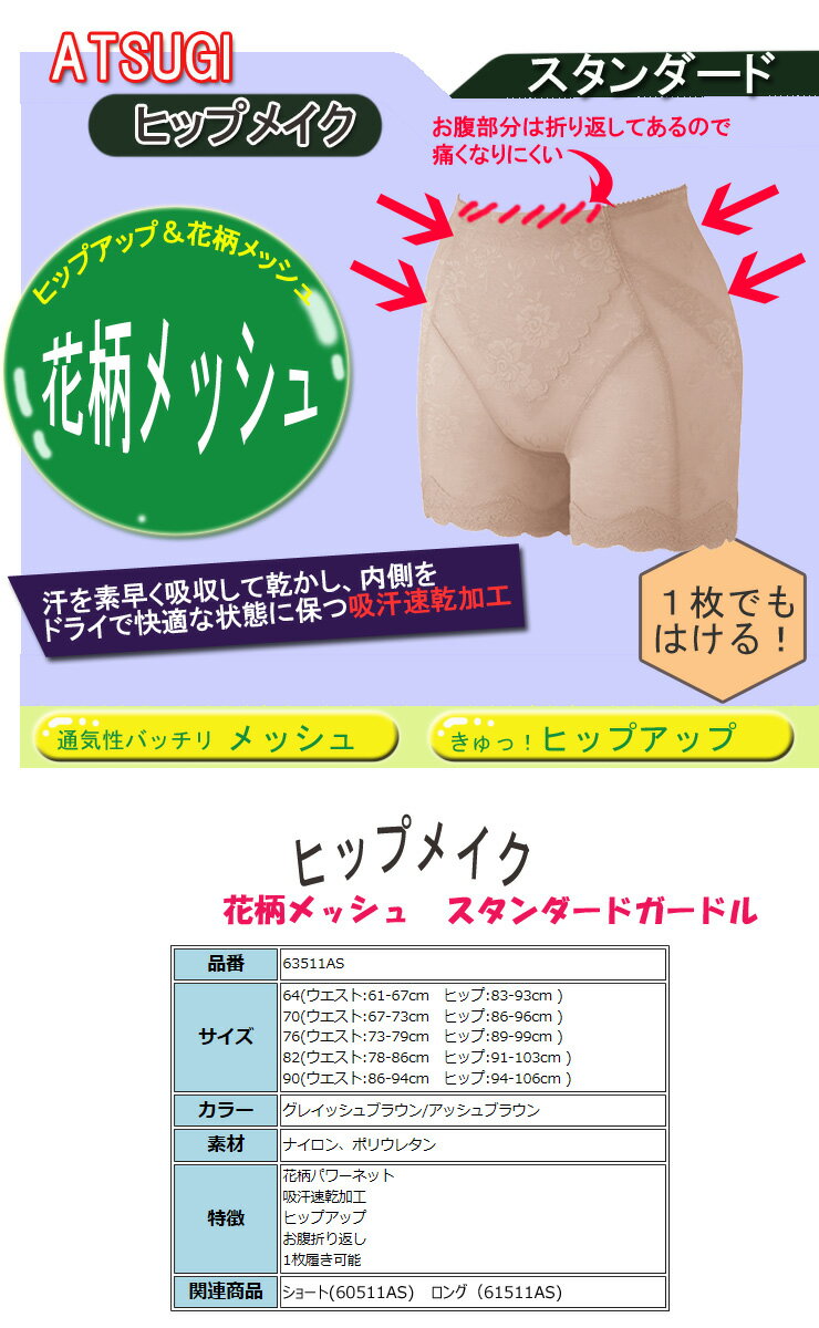 【アツギ】ヒップメイク 花柄メッシュ スタンダードガードル(63511AS)/アツギガードル/ガードル/骨盤矯正ベルト/お腹折り返し/矯正下着/矯正ベルト姿勢/パワーネット/ガードルショーツ/ガードルヒップアップ/吸汗速乾/(01837)