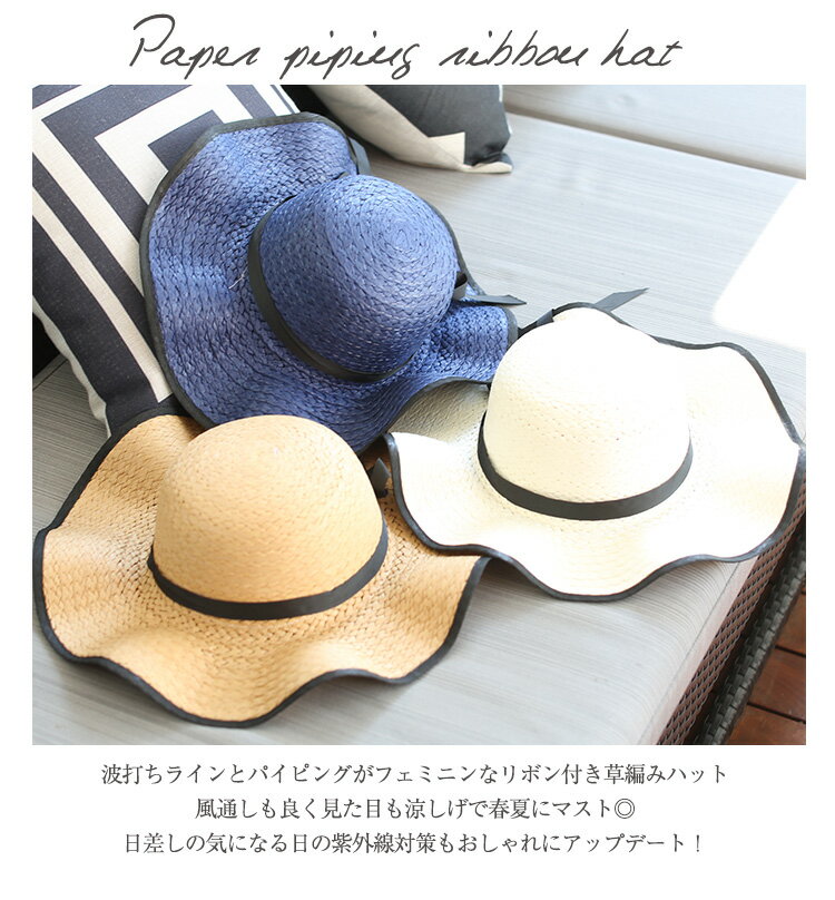 この商品について 5773〔ペーパーパイピングリボンハット〕 波打ちラインとパイピングがフェミニンなリボン付き草編みハット 風通しもよく見た目も涼しげで春夏にマスト◎ 日差しの気になる日の紫外線対策もおしゃれにアップデート! サイズ 全長(たて):約10cm/周囲:約56-58cm/つば:10cm ※上記はおおよそのサイズです。