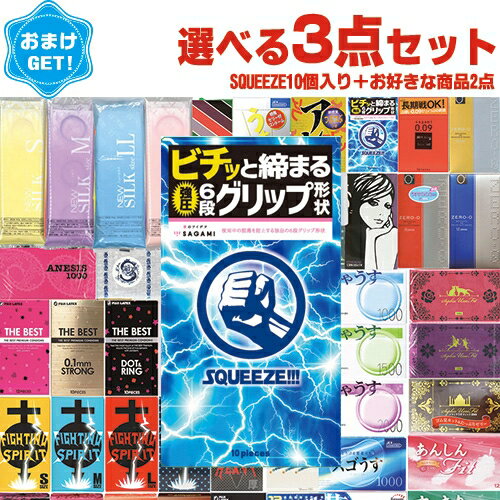◆(あす楽発送 ポスト投函!)(送料無料)(さらに選べるおまけGET)自分で選べるコンドーム3箱セット! 相模ゴム工業 SQUEEZE!!!(スクイーズ) 10個入り + 国内メーカーコンドーム×2箱(選択可)セット - 有名国産スキン3箱セット(ネコポス)【smtb-s】