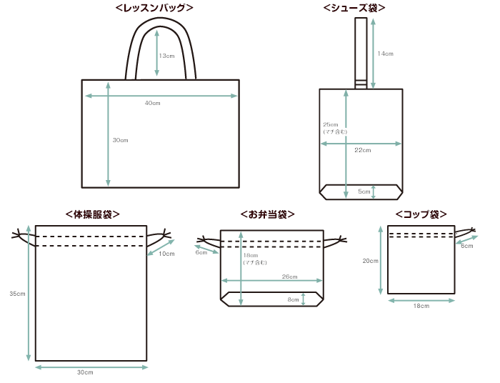 商品情報 サイズ 【レッスンバッグ】縦30cm 横40cm 持ち手13cm 【体操服袋】縦35cm 横30cm 持ち手10cm 【シューズケース】縦25cm(マチ含む) 横22cm 奥行き5cm 持ち手14cm 【お弁当袋】縦18cm(マチ含む) 横26cm 奥行き8cm 持ち手6cm 【コップ袋】縦20cm 横18cm 持ち手6cm ※商品のサイズは、すべて 平置きにて外寸を測定しております。
